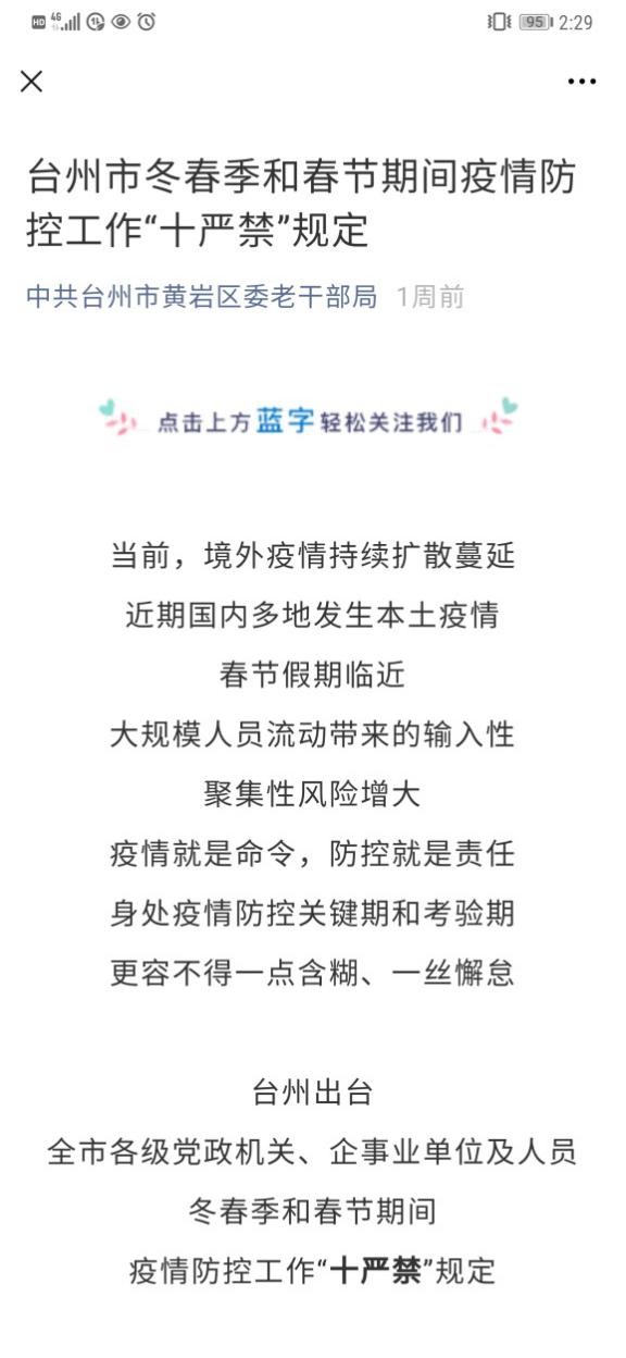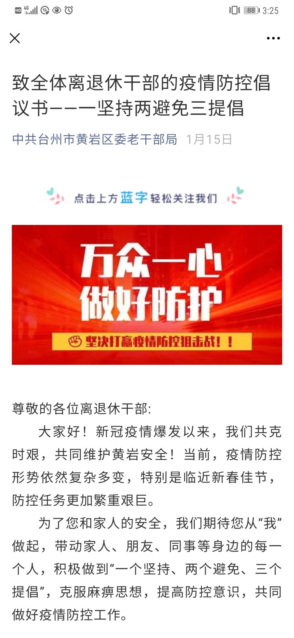 浙江台州市黄岩区委老干部局积极响应党委政府关于节前疫情防控工作的重要指示和决策部署,全力把好思想认识、关心关爱、场所安全、示范引领“四大关口”,全方位抓实春节前老干部疫情防控工作。 一、把好“思想认识关”,增强防疫共识。发出《致全体离退休干部的疫情防控倡议书》,号召广大离退休干部始终保持高度的政治自觉和行动自觉,做好个人及家庭防护,勤洗手、多通风、少聚集、正确佩戴口罩,增强自我保护意识,自觉减少聚会、外出,不给疫情反弹以可乘之机。 二、把好“关心关爱关”,传播防疫知识。上门走访慰问高龄、空巢、独居和家庭生活有困难的老同志,主动了解其出行、返程和身体健康情况,并逐一发放自编的防疫知识小册子,同时通过公众号、QQ群、微信群等各类信息平台,多渠道传播科学预防方法,引导广大老同志学好用好自我防控知识。 三、把好“场所安全关”,开展防疫演练。区老年大学专门建成可实时发送学员进出校门图像到其家属微信的实时家校通系统,以及自动人脸识别、自动感应测温、健康扫码智能门禁系统。健康扫码系统直接与区大数据发展中心联网,确保防控信息可追溯。同时,区老年大学和区老干部活动中心专门开展冬季防疫安全演练活动,对登记验码、健康申报、测温消毒、活动实景等环节进行全程演练。 四、把好“示范引领关”,贡献防疫力量。引导全区老干部充分发挥示范带动作用,就近在居住社区、周边街巷、公共场所助力疫情防控,主动配合各种防控措施落实,积极参与联防联控、群防群控,共同筑起“外防输入、内防反弹”的有力防线。引导开展文艺抗疫,老年大学学员刘兰贞在《艺术人物》杂志举办的2020年抗疫纪念活动中被评为“大爱艺术家”;学员孔征海的拉丁舞《我的祖国》入选“致最美逆行者”全国中老年艺术作品线上展演,其本人被授予“抗疫公益之星”称号。