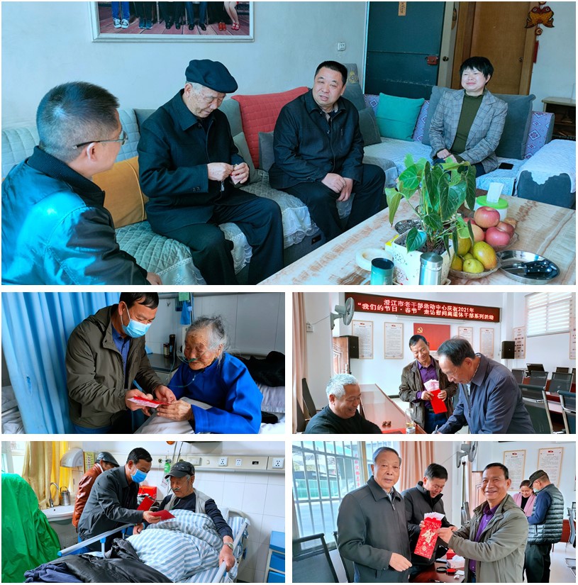 2021年的春节如约而至,面对全球仍在肆虐的新冠肺炎疫情,云南玉溪澄江市委、市政府高度重视春节疫情防控和走访慰问工作,多方谋划,精心部署,将离退休干部走访慰问纳入全市各类慰问大局,制作致全市离退休干部慰问信,向全市离退休干部致以节日的慰问和衷心的祝福。市委书记、市长率队分六个组开展为期10天的走访慰问工作,奏好春节走访慰问离退休干部“三步曲”。 一是奏好走精走准“序幕曲”。根据市委、市政府《关于做好2021年元旦春节期间的有关工作的通知 》(澄办发电〔2021〕4号)精神,中共澄江市委组织部按照相关制度认真梳理慰问对象,精确人数和慰问标准,研究开展慰问方式;明确春节慰问活动采取分组、分批次的形式,以发放市委、市政府一封慰问信和现金方式展开,对特殊困难离退休干部、党员一律采取走访慰问方式。慰问共涉及全市9类离退休干部、遗孀210人,自2021年2月1日——10日全面启动全市走访慰问离退休干部工作。市委组织部及时发出工作提醒,要求全市各部门、各单位结合实际扎实开展本单位离退休干部春节走访慰问工作,形成上下联动、共同发力的工作局面。 二是奏好走实走深“主题曲”。走访慰问摒除单纯的物质关爱,将精神慰藉提到一个高度,做到“锦上添花”和“雪中送炭”相融合。市委书记孙金会走访慰问澄江市目前唯一健在的老八路原景福时,深情地说:您为国家繁荣昌盛,抛头颅