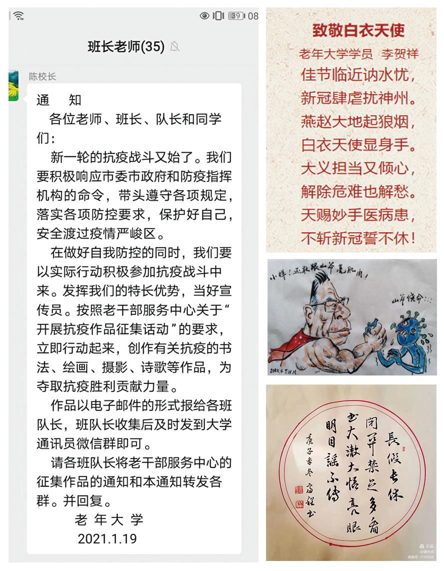 针对当前疫情严峻形势,黑龙江齐齐哈尔讷河市老年大学按照市委市政府统一部署要求、按照老干部服务中心统筹安排,在疫情防控工作中,组织有力,措施有效,携手全校师生共同抗击疫情,科学做好各项防控工作,用实际行动践行初心和使命,为疫情防控工作作出了积极贡献。 一、以“云”传声,坚定战疫必胜信念 老年大学多措并举筑牢师生疫情防控“保护网”。一是坚持每天排查全校师生防疫情况,通过电话、微信、QQ、公众号等信息平台,详细了解身体状况、活动轨迹、是否接触过确诊或疑似病例等信息;二是加强对师生疫情防控的教育指导,通过微信公众号发布《致全市广大离退休干部做好新冠肺炎疫情防控的倡议书》《讷河市老年大学学员的一封家书》,引导全体师生强化大局意识,充分发挥示范作用、树立长者风范,带动身边亲友、老年人共同做好科学防护。 二、以“细”应战,一丝不苟严防严守 校门紧闭,对健康负责,更是对生命负责。作出周密部署,与新冠病毒斗智斗勇,做好活动场所消毒杀菌,对教室、走廊等公共区域进行全面的消毒喷洒作业,不留死角,做到不懈怠、不侥幸,保持高度警惕。 三、以“艺”寄情,汇聚同心抗疫力量 在这场战役中,学校发挥优势,让文艺冲锋陷阵,发挥作用。1月19日,老年大学开始征集以战“疫”为主题的文艺作品,得到广大学员的积极响应,截至目前,共收集诗词作品47首,书法作品46幅,绘画作品22幅,摄影作品90余幅,原创抗疫音乐3首。学校也在第一时间收集整理这些作品并在老年大学公众号上进行发布。每一件作品都是老年大学师生用心中的爱、手中的笔记录下的感人画面,这些作品有情怀、有温度、有力量,讴歌战疫英雄,致敬人间大爱,谱写了一首首爱的赞歌。 老年大学的师生们以各自不同的方式抗击疫情,时刻向身边人传递正能量。莫道桑榆晚,为霞尚满天。讷河市老年大学将继续在抗击疫情中发挥积极作用,与全国人民一起齐心协力,践行初心与使命,抒写老年教育的炙热情怀,展现攻坚克难的身影!我们坚信:讷河必将更加美好,讷河市老年大学必将更加靓丽! |