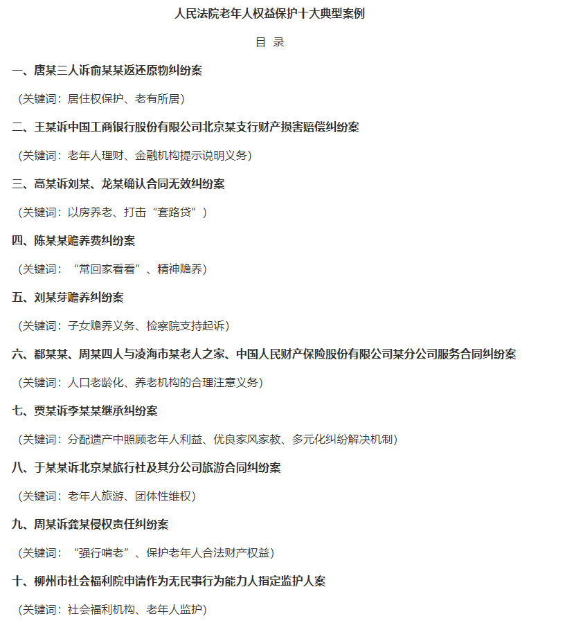最高人民法院24日召开新闻发布会,发布十件老年人权益保护典型案例,包括老年人财产权保护、人身权保护等方方面面。 典型案例中包括一起“以房养老”诈骗案件。最高法表示,近年来,一些别有用心的人借用“以房养老”的名义欺骗老年人,以达到非法侵占老年人房产的目的。人民法院在审理相关案件时要注重甄别,对不法行为加大打击力度,切实保障老年人“老有所养”。 在发布的典型案例中,还包括一起“强行啃老”案件。案件显示,92岁老人被子孙带至农村信用社某营业厅,对其账户进行挂失,取出存款24万元并存入孙女账户。 最高法指出,本案体现了反对子女“强行啃老”的价值导向。老年人由于身体状况、行动能力等原因,往往难以有效管理、处分自有财产,在此情况下,子女更不得以窃取、骗取、强行索取等方式侵犯父母的财产权益。人民法院在审理此类侵犯老年人权益的案件时,应当充分查明老年人的真实意愿,坚持保障老年人合法权益,秉持保护老年人合法财产权益的原则进行判决,有效定纷止争。 |