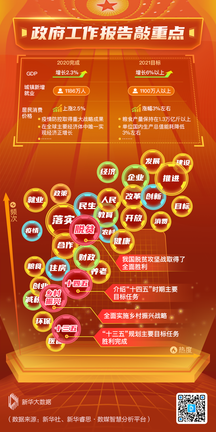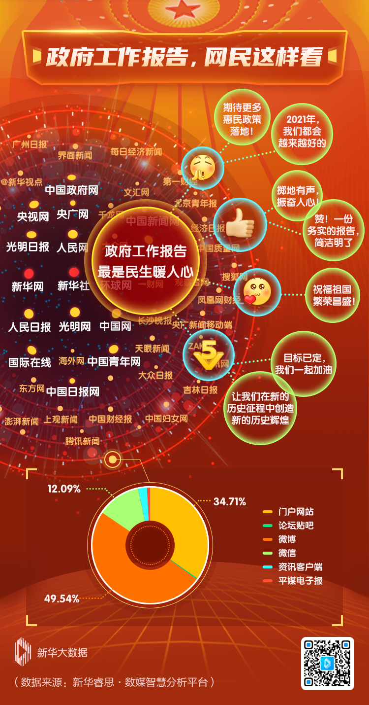 十三届全国人大四次会议5日上午9时在人民大会堂开幕,国务院总理李克强代表国务院向十三届全国人大四次会议作政府工作报告。 百姓关切热点即报告聚焦亮点 2021年政府工作报告对“十三五”时期发展成就进行回顾,并对“十四五”时期主要目标任务进行展望。新华睿思语义分析结果显示,政府工作报告内容紧紧围绕“发展”“改革”“民生”,频频提及网民关注热度较高的“就业”“健康”“教育”“收入”“环保”等话题,将人民利益放在第一位,全面回应百姓关切。 “全球主要经济体中唯一实现经济正增长”“全年国内生产总值增长2.3%”“为市场主体减负超过2.6万亿元”“城镇新增就业1186万人”“年初剩余的551万农村贫困人口全部脱贫、52个贫困县全部摘帽”等内容也成为今年政府工作报告中出现的亮点,这不仅体现了过去一年我国交出一份人民满意、世界瞩目、可以载入史册的答卷,更彰显出我国经济发展的韧性与活力。 各方媒体聚合发力,话题实现多点多级渗透 这份暖心又提气的报告迅速引发各级媒体与广大网民的热烈关注。新华睿思数据显示,3月5日9时至18时,全网共有“政府工作报告”相关信息超30万条,各平台话题热度持续高涨,网民纷纷留言“赞!一份务实的报告,简洁明了”“掷地有声,振奋人心!”。 谋划未来再起航 值得注意的是,政府工作报告明确了“今年国内生产总值增速在6%以上”的目标,并对财政、减税降费、消费和创新等重点领域工作进行部署,相信这一年我国改革开放和社会主义现代化建设将取得新的重大进展,为“十四五”开好局,起好步。 重任在肩,更须砥砺奋进! (数据统计时间:2021年03月05日09:00-03月05日17:00) |