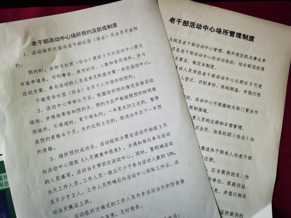 三是完善机制。为规范有序开展活动,对机制制度和防疫流程进行完善。建立《场所预约及防疫制度》《场所管理制度》《活动中心人员来访登记制度》等一系列规章制度,对场所预约使用、日常管理进行规范,避免发生扎堆、拥挤的情况。同时明确测温、验码等必要防疫流程,推动防疫工作常态化。