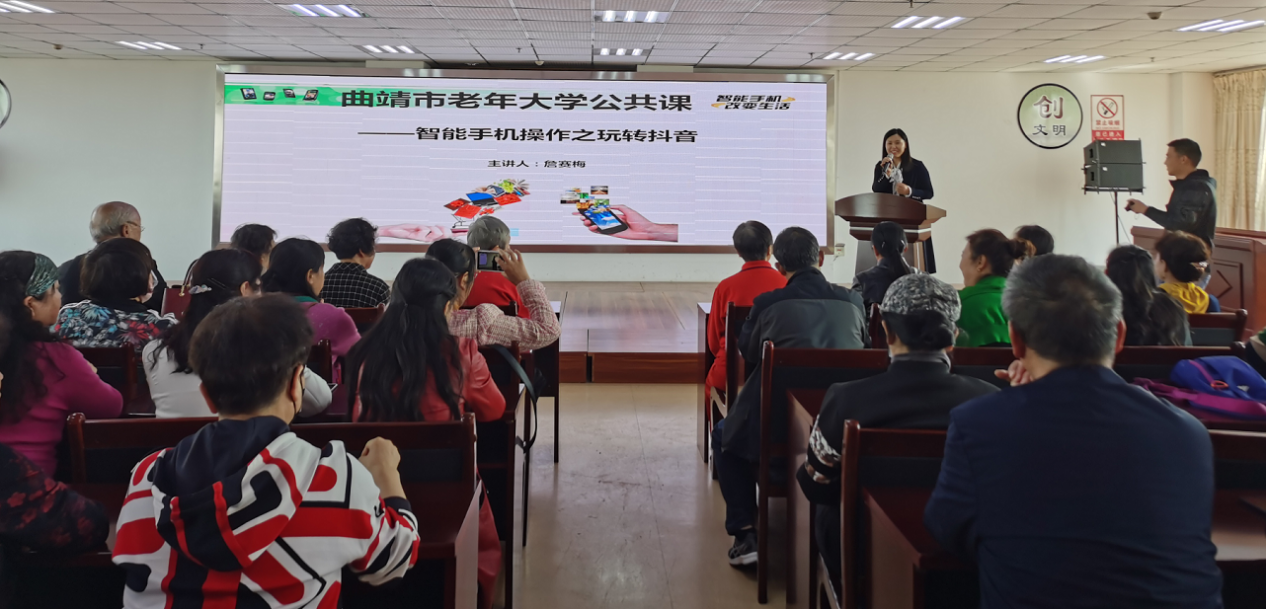 伴随智能手机的广泛使用,各式新奇有趣的软件受到大众青睐,“抖音”作为一款音乐短视频社交软件在年轻群体中悄然流行,为帮助老年群体赶上智能化新“时髦”,3月25日,曲靖市老年大学举办“智能手机操作之玩转抖音”专题讲座,帮助老年学员跨越“数字鸿沟”。 本次讲座主要围绕抖音软件的基本功能、如何下载注册抖音、抖音界面操作三个方面进行讲述,重点讲解了如何拍摄抖音短视频。主讲人利用多媒体设备将操作流程步骤化展示,现场带领老同志进行抖音软件操作,并对高龄学员提供“手把手”指导教学。深入细致地讲解,有效帮助在座学员基本掌握了抖音技能。讲座现场座无虚席,学员们热情高涨,有的老同志在现场完成了人生中第一个“影视作品”,实现了“刷抖音”的小愿望。 |