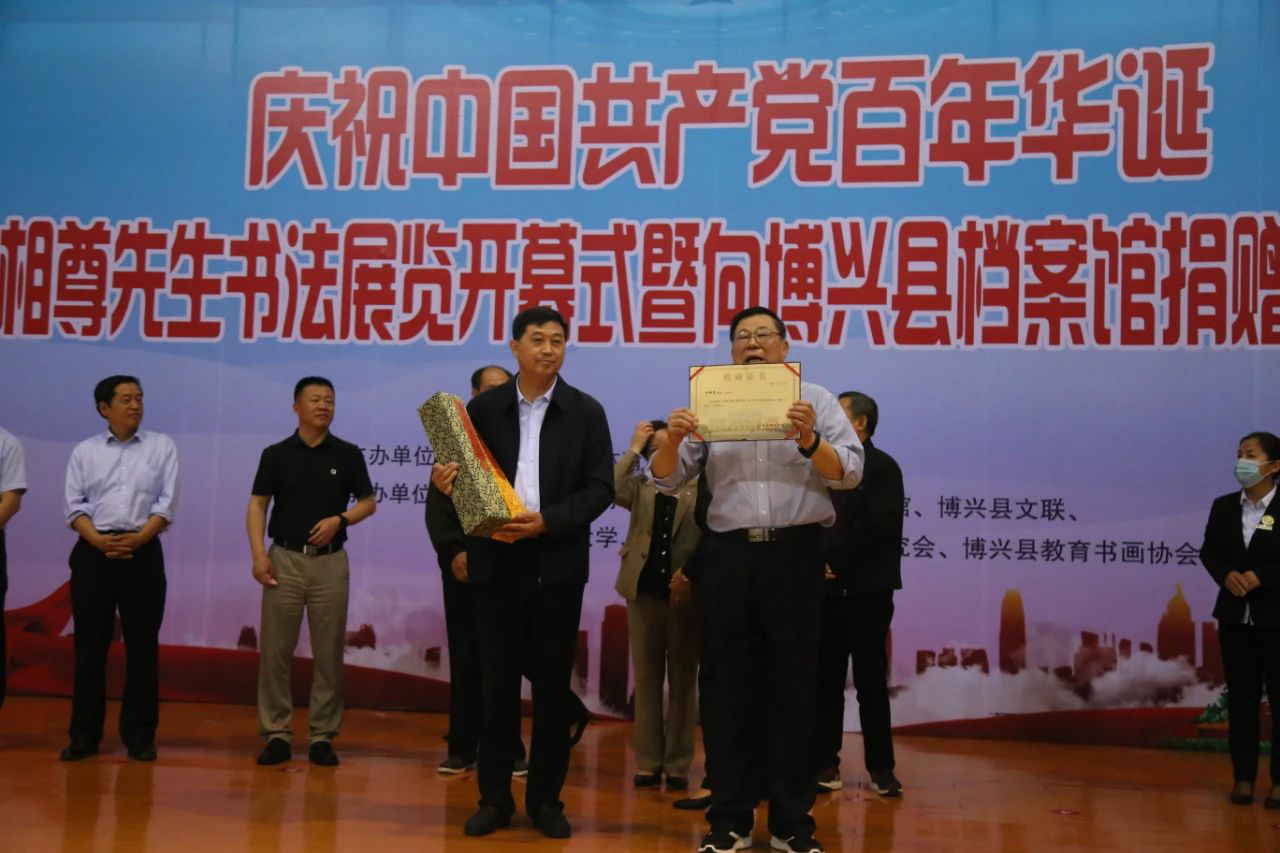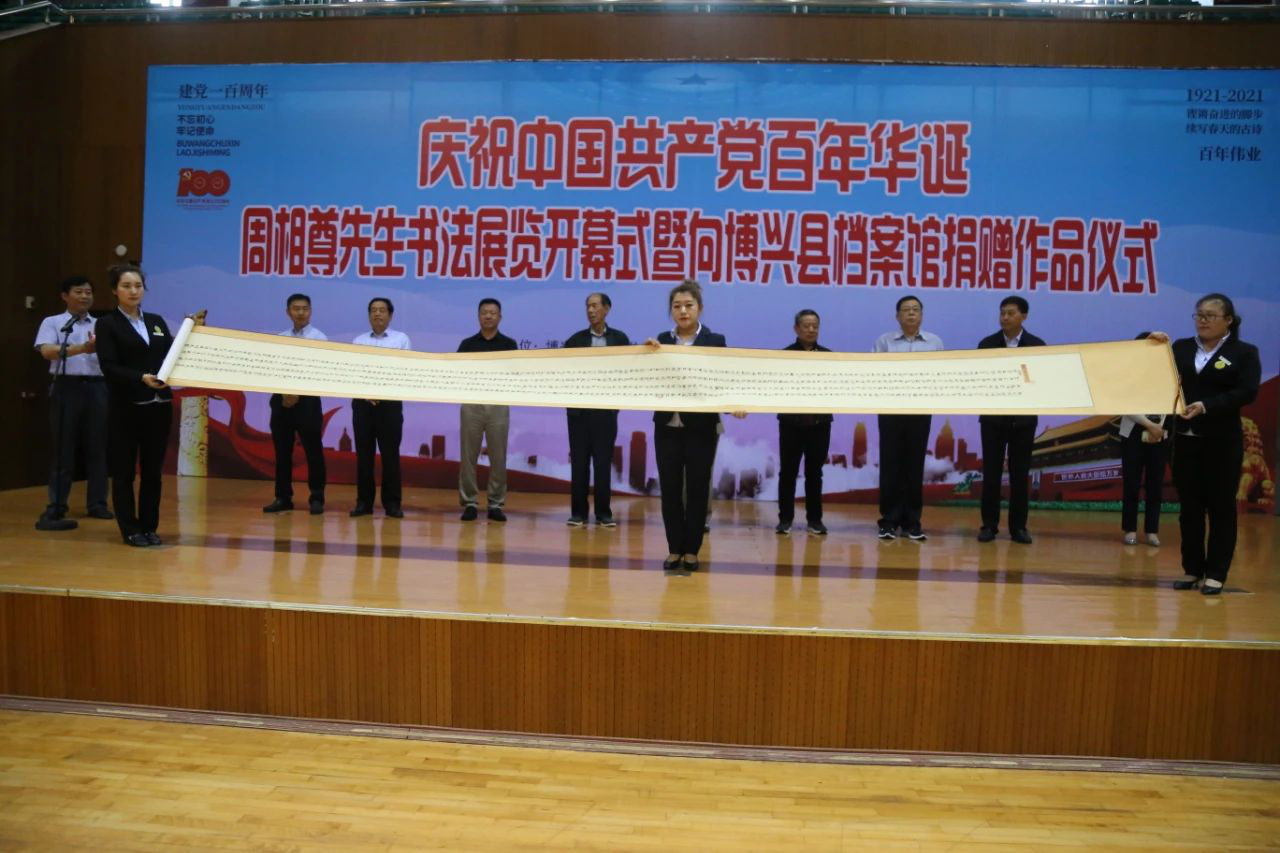 为大力弘扬中华优秀传统文化,积极倡导全县广大教师唱响新时代主旋律,坚定“听党话、跟党走”的理想信念,5月18日,滨州博兴县举办庆祝中国共产党百年华诞周相尊先生书法展览开幕式暨向博兴县档案馆捐赠作品仪式。县委常委、宣传部部长、县委教育工委书记韩颖,县渤海美术书法研究会原会长安之良,县渤海美术书法研究会原会长李志锦,退休老教师、县渤海美术书法研究会原常务副会长周相尊,县委教育工委常务副书记、县教育和体育局党组书记、局长李光辉,县档案馆馆长刘忠泉,县文联主席、县书协主席卞涛,县老干部活动中心主任、老年大学校长朱丽芳,县文化旅游新闻出版局党组成员、副局长徐健出席开幕式。县教育事业发展中心副主任贾晨光主持。 开幕式上,李光辉在致辞中介绍了退休老教师周相尊先生的艺术成就,对他爱国爱党的伟大情怀表示崇敬。他表示,书法艺术蕴涵着中国传统文化的精髓,比较集中地体现了中国艺术的基本特征,承载着中国文化的审美意趣。直到今天,我们仍然以“字如其人”“书为心画”作为对一个人修养的重要评价标准。他希望大家能以此次活动为契机,强化爱国爱家的伟大情怀,注重个人修养,立足岗位干好本职工作,把家国情怀转化为奋斗激情,为中国共产党百年华诞献礼! 捐赠仪式上,周相尊先生向县档案馆捐赠了《千字文》隶书长卷、《千字文》楷书长卷两幅书法作品。县档案馆向周相尊先生颁发了收藏证书。 据悉,庆祝中国共产党百年华诞周相尊先生书法展览展出的个人作品共分汉简、汉隶、章草、行草、草书、行书、行楷、楷书八种书体,或临摹或创作长卷与册页四十余幅,共三十余万字。 |