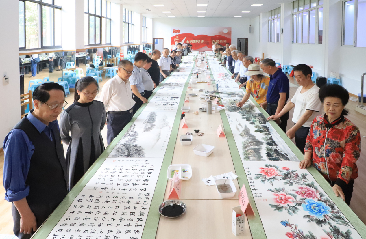 活动现场,老同志们尽情挥毫泼墨、妙笔丹青,用34幅飘逸清新的书法作品和栩栩如生的画作,组成了一幅气势恢宏的百米书画长卷,抒发出老同志们对伟大的党和祖国的崇敬热爱之情和坚定不移“感党恩、听党话、跟党走”的决心,充分展示了宜宾离退休干部的金秋风采。市老年诗书画研究会常务副会长张树成、副会长王永武以及会员近50人参加活动。