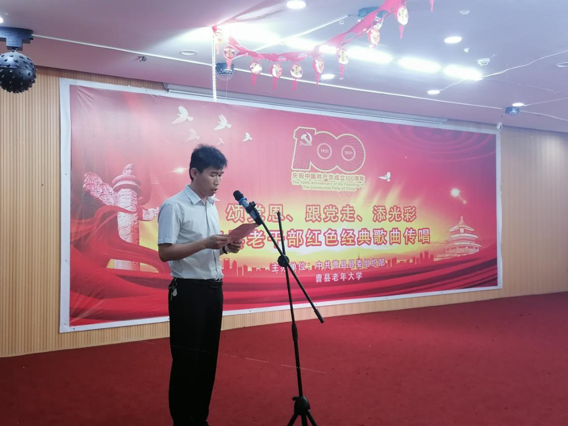 为庆祝中国共产党成立100周年,在离退休干部党组织中开展好“颂党恩、跟党走、添光彩”主题党日活动。根据省市通知精神,菏泽曹县县委组织部、曹县老年大学在老年大学多功能厅举办“颂党恩、跟党走、添光彩”红色经典歌曲传唱活动。曹县老年大学校长杨绪耀同志出席活动并致辞。 为开展好红色经典歌曲传唱活动,县委组织部、县老年大学专门研究实施方案,下发通知,在全县范围内征集节目。经过初选,22个节目进入决赛。6月11日,在老年大学多功能厅举办“颂党恩、跟党走、添光彩”红色经典歌曲传唱活动。 活动在壮美雄浑,气势磅礴的《沁园春·雪》中拉开帷幕。通过《为了谁》《党啊,亲爱的妈妈》《我爱你中国》等20余首耳熟能详的红色经典节目,抒发老干部对我们伟大的党、伟大祖国的赞美之情,表达了对祖国的热爱和对建党百年的祝福。 活动最后,老年大学校长杨绪耀同志、副校长吴爱美同志为优秀节目颁奖。 |
