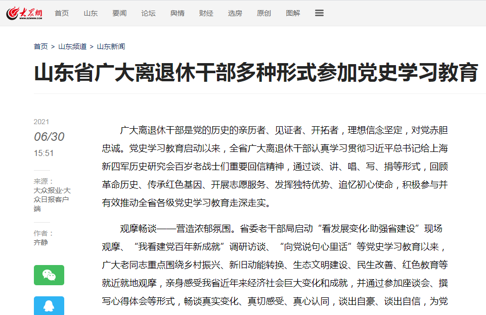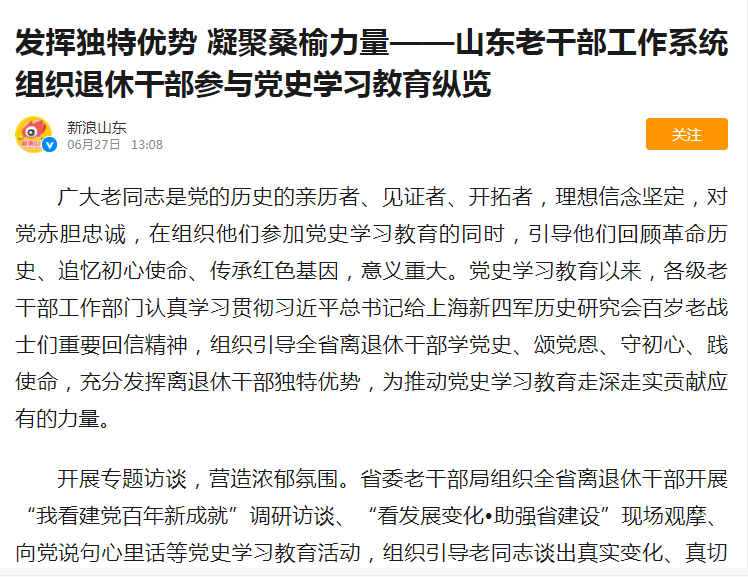 近期,多家新闻媒体集中报道了全省离退休干部积极参与党史学习教育,多种形式推动党史学习教育走深走实的有关做法,点赞广大老同志对党忠诚、无私奉献、退休不褪色的责任担当和高尚情怀。 7月26日,《大众日报》在第2版要闻栏目刊登题为《凝聚“银发”力量 展现“桑榆”担当》报道文章,点赞全省广大离退休干部多种形式推动党史学习教育走深走实有关事迹。 6月27日,新浪山东——《发挥独特优势 凝聚桑榆力量——山东老干部工作系统组织退休干部参与党史学习教育纵览》。 7月14日,《中国老年报》头版头条刊登题为《发挥独特作用 凝聚桑榆力量》文章,点赞全省广大离退休干部积极参与并有效推进党史学习教育走深走势有关做法。 7月4日,齐鲁网——《牢记初心仍励志 山东省广大离退休干部多种形式参加党史学习教育》。 6月30日,《齐鲁壹点》刊登文章报道党史学习教育中央第四指导组到山东省委老干部局视察指导工作有关情况。 6月30日,大众日报客户端——《山东省广大离退休干部多种形式参加党史学习教育》。 7月8日,《山东商报》——《初心与光荣:老干部的“新青春”》。