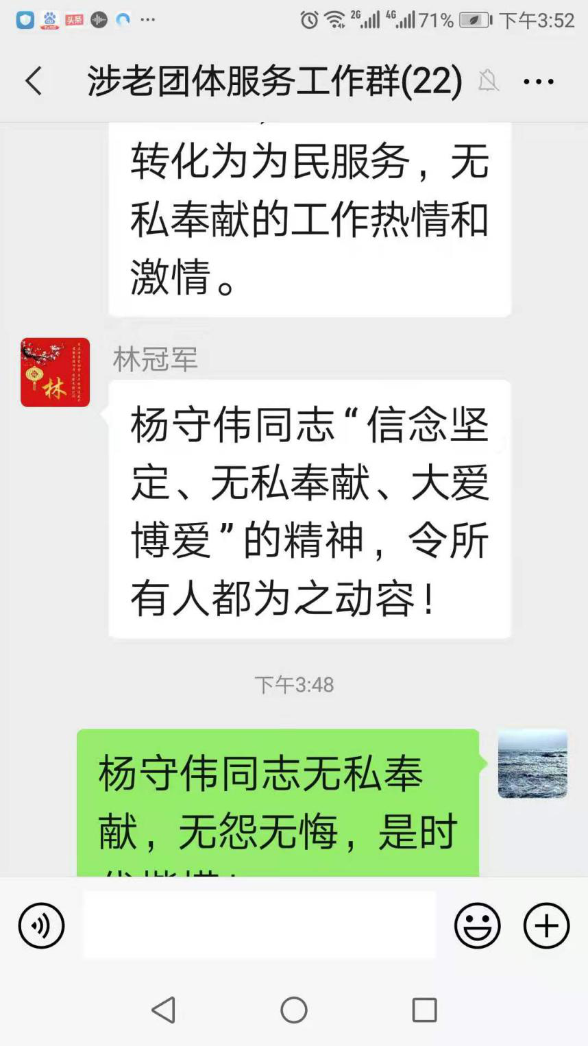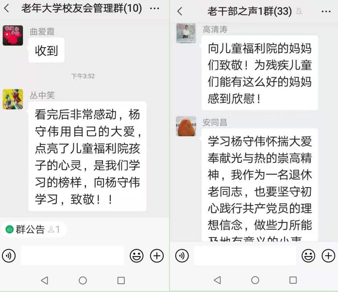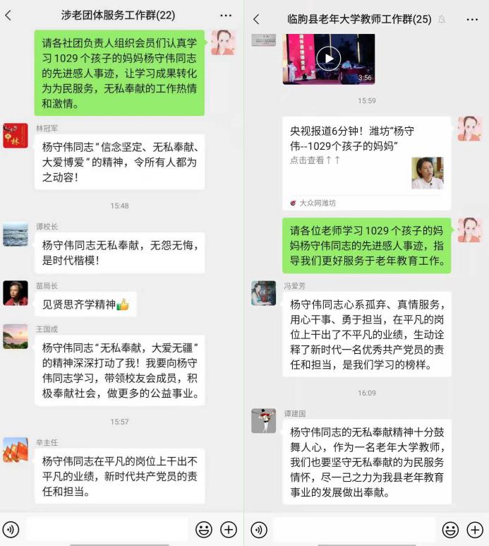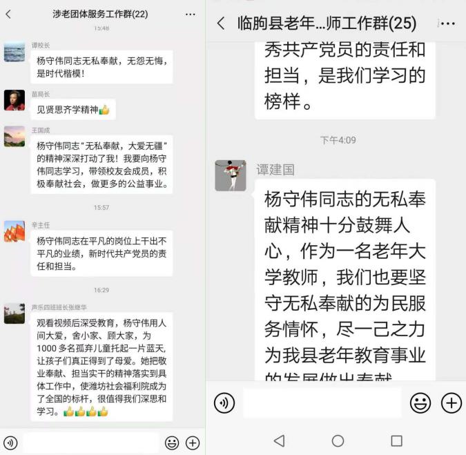 “央视《新闻联播》播出《杨守伟:用爱为孤残儿童撑起一片天》!”近日,潍坊临朐县委老干部局将视频推送到各离退休干部党支部、老年社团联盟、老干部之声、老年大学班级等微信群,杨守伟的感人事迹犹如一股“冲击波”,在全县老干部中引起了强烈反响。 “21年,1029个孩子在福利院有了妈妈,467个孩子得到康复并有了新家,这一连串的数字展示着杨守伟同志无私的大爱和坚守的初心。大家纷纷表示,将以杨守伟为标杆,全身心地做好各项工作,以实际行动向榜样致敬。 临朐县政协原副主席安同昌表示:杨守伟同志是时代的楷模,她心中无我,以忘我的工作阐释什么是初心;她大爱无私,甘做社会的暖心人……她用无悔奉献诠释人生的意义,用至善至美演绎人家大爱,杨守伟同志值得我们每一个人学习!作为一名退休老同志,我将坚守初心,践行共产党员的理想信念,力所能及地做一些有意义的小事情,更好地奉献服务社会! 临朐县政府原党组成员、县关工委副主任傅光永表示:杨守伟把大爱献给了1029个孩子。母爱,升华了的母爱!社会主义制度下的大家庭。不由想起一句歌词,“这是心得呼唤,这是爱的奉献,只要人人都献出一点爱,世界将变成美好的人间”。作为一名关心一代工作的老同志,我将践行初心使命,带动更多老同志参与到关心下一代的事业中来,当好青少年的“引路人”,为培养社会主义建设者和接班人作出新的贡献! 临朐县老年大学校友会会长、党总支副书记王国成表示:杨守伟的无私奉献精神深深感染了我,为我们校友会树立了工作标杆。她大爱无疆,无私奉献,在平凡岗位上做出了不平凡的业绩,我要向杨守伟同志学习,带领校友会成员一起发挥正能量,做更多的公益事业,更好地回报社会! 临朐县花样年华歌舞队党支部书记张继华表示:从杨守伟身上,我感受到了她无私奉献的高贵品质,她用人间大爱舍小家、顾大家,为1000多名孤弃儿童托起一片蓝天,让孩子们真正得到了母爱。她把敬业奉献、担当实干的精神落实到具体工作中,使潍坊社会福利院成为全国的标杆,很值得我们深思和学习! 临朐县老年社团梦之队秘书长刘明亮表示:杨守伟同志用无私大爱为1029名弱小孤弃儿童当好妈妈,21年来始终坚守朴素的为民情怀,在平凡的岗位上干出了不平凡的业绩,生动诠释了新时代一名优秀共产党员的责任和担当!她的事迹感人至深,催人奋进,是广大党员的好榜样。向榜样学习!向榜样致敬! 临朐县老年大学声乐教师刘京钦表示:杨守伟同志的事迹感人,震撼人心,催人奋进,她毫不利己、专门利人、全心全意为人民服务的精神值得我们学习。作为老年大学的一名老师,我将以杨守伟为榜样,从平时做起,从岗位做起,从点滴做起,为老年教育贡献自己的微薄之力! 临朐县老年大学合唱专业教师冯爱芳:杨守伟同志心系孤弃、真情服务,用心干事、勇于担当,在平凡的岗位上干出了不平凡的业绩,生动诠释了新时代一名优秀共产党员的责任和担当,是我们学习的榜样!