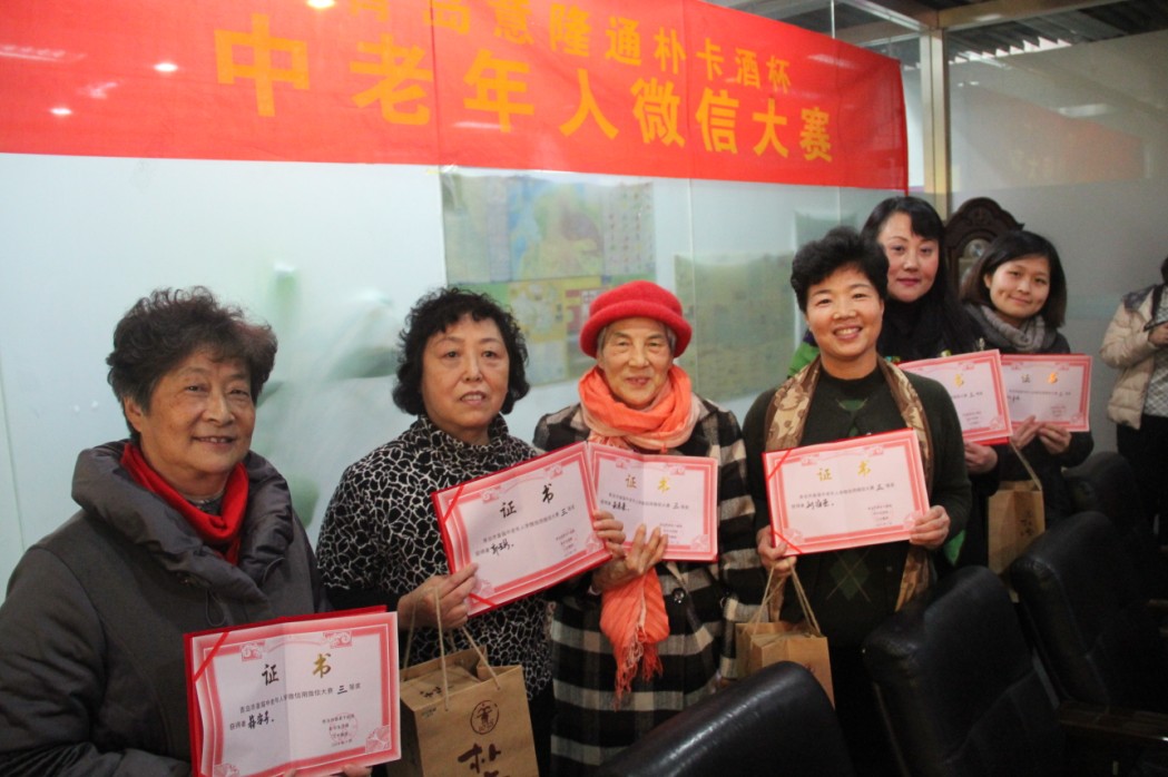 1月7日,由青岛市委老干部局、老年生活报、江中集团主办,腾讯·微青岛、中国养生健康网、青岛市老干部活动中心、青岛意隆通商贸有限公司承办的青岛市首届老干部学微信用微信大赛举行。 参赛现场,老同志学习了微信的使用方法,了解了如何发朋友圈及如何参与公众账号的各种活动,并进行比赛及颁奖。 78岁的黄女士在孙子的陪同下来参加比赛,她说,对于新媒体她充满了好奇,子女们都很支持她,孙女还给她买了部智能手机,她每天都用微信和家人聊聊天,觉得和他们的距离更近了。 随着社会的发展,新媒体在老年朋友精神文化生活中发挥着越来越重要的作用,简单实用的老年数字化平台,是应对人口老龄化,实现文化养老的重要举措。通过微信大赛等方式,让更多的老年同志掌握新媒体的使用方法,架起与社会、亲友的沟通平台,让沟通触手可及,使老同志精神文化生活更加丰富多彩。