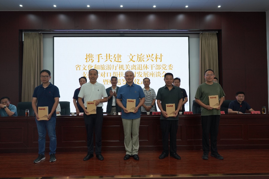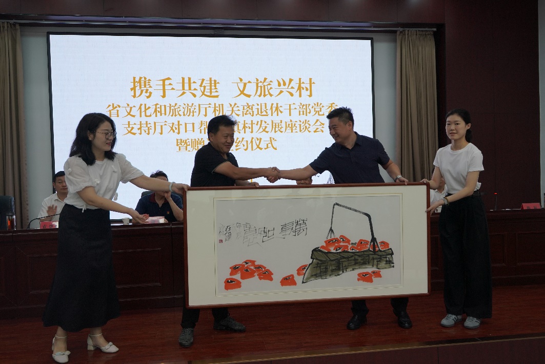 在邳庄镇政府,厅机关离退休干部党委、厅离退休干部处与对口帮扶镇村召开座谈会,代表省文化和旅游厅向当地镇政府和6个对口帮扶村捐赠老同志书画作品,希望通过艺术的传播为帮扶镇村增加精神力量,增强村民对乡村的认同感和归属感,用艺术熏陶进一步激励广大群众,让优秀文化成果更加润泽人心。